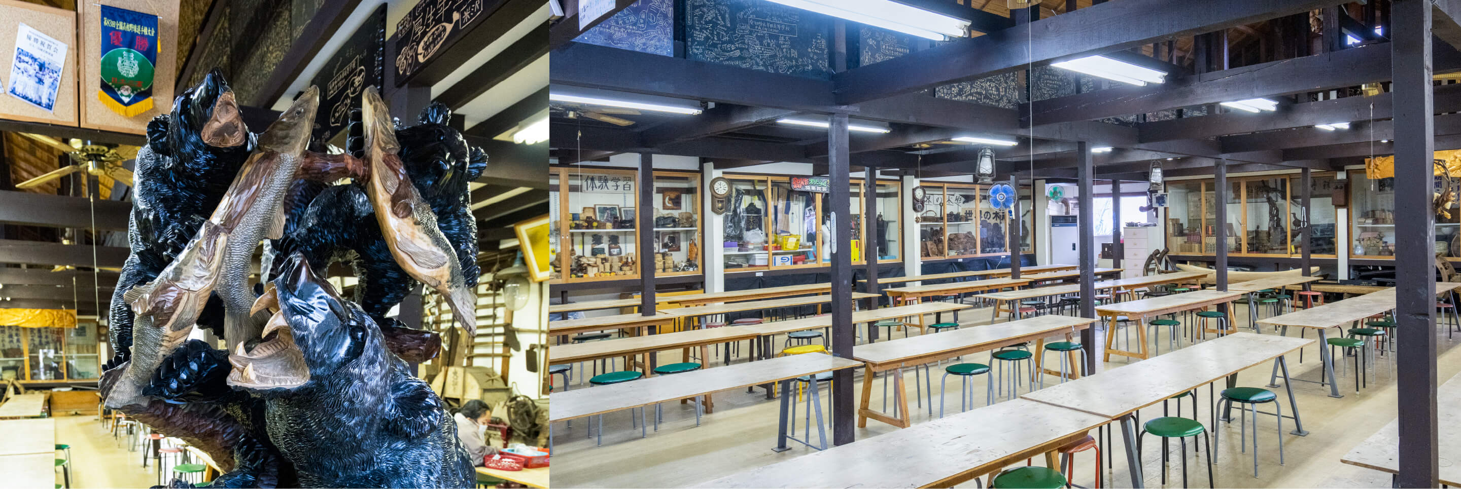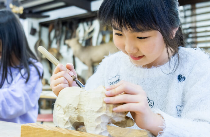 伝統の熊の木彫り体験。荒削りされた
